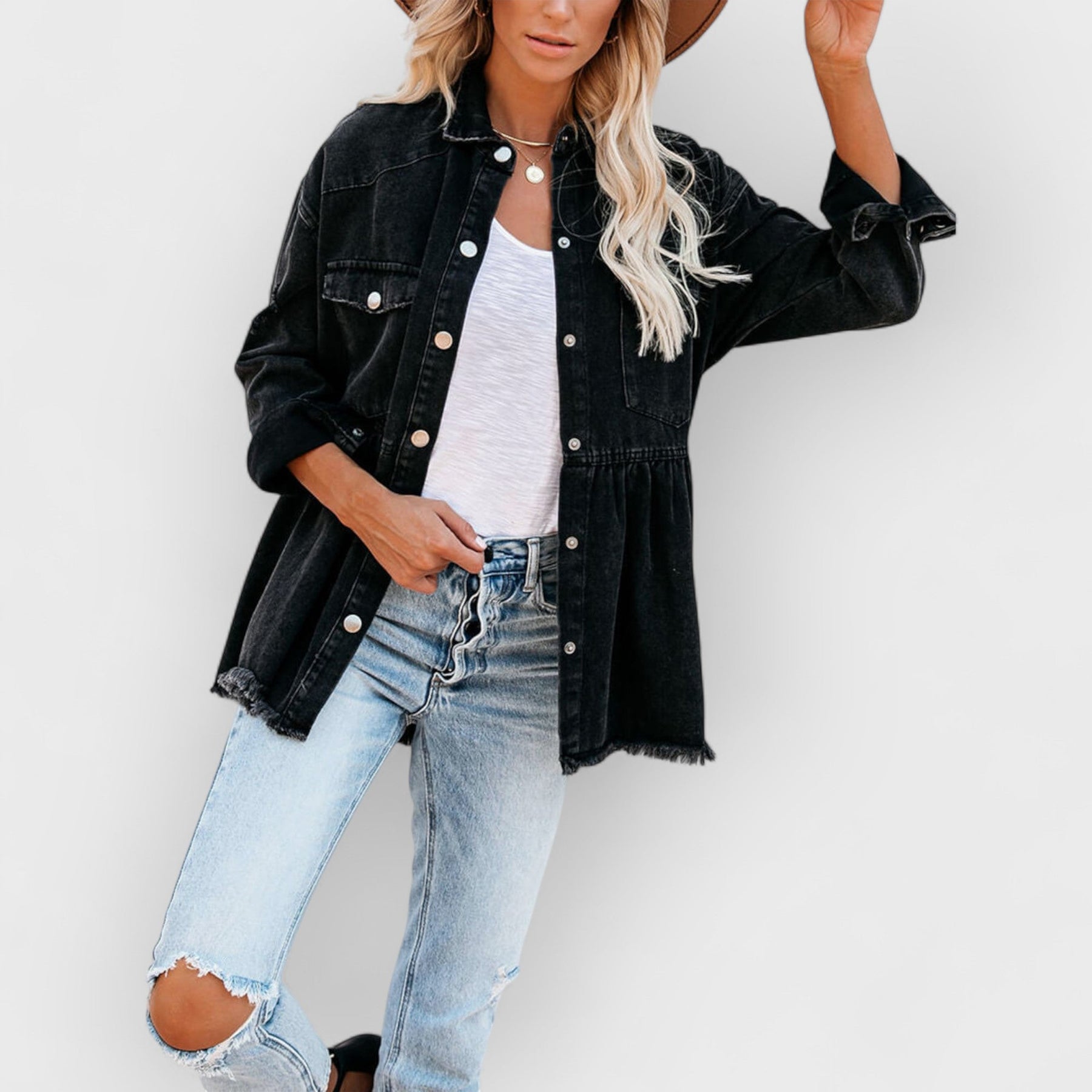 The Kasia - Distressed Denim Jacket is your new third-piece essential for that perfect undone look. The artful distressing and natural fading suggest years of adventures, while the regular fit keeps things comfortably relaxed. Layer it over tees when the evenings get chilly, or wear it buttoned up with jeans for a double-denim moment - this is the kind of piece that develops more character the more you wear it. Made from a soft fabric blend that moves with you, it's the effortless layer your transitional wardrobe needs.