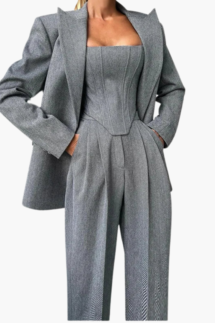 Our popular 3-piece ensemble combines structure, sophistication, and bold femininity – designed to leave a lasting impression in any room. Featuring a tailored blazer, a contoured corset, and high-waisted pants, this bestseller power set offers endless styling possibilities and a silhouette that radiates strength and grace.